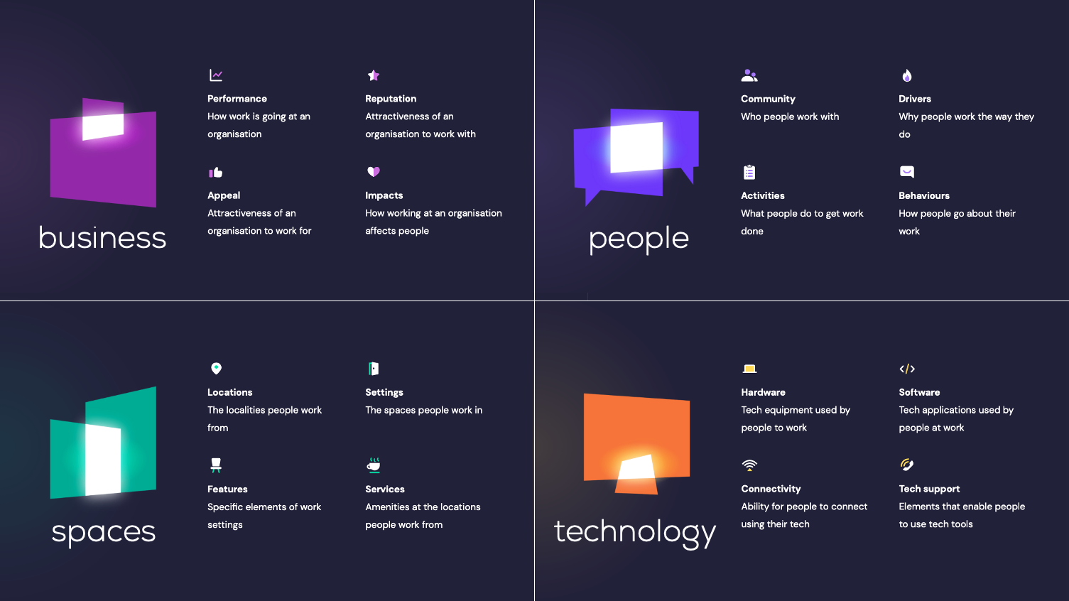 Taken together, these four themes give you full coverage of the working world - not just bricks and mortar, not just people or IT, but the entire workplace landscape. Whatever someone might say about their experience of work, it belongs somewhere in the Mix.
